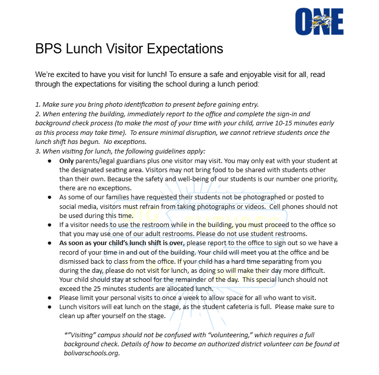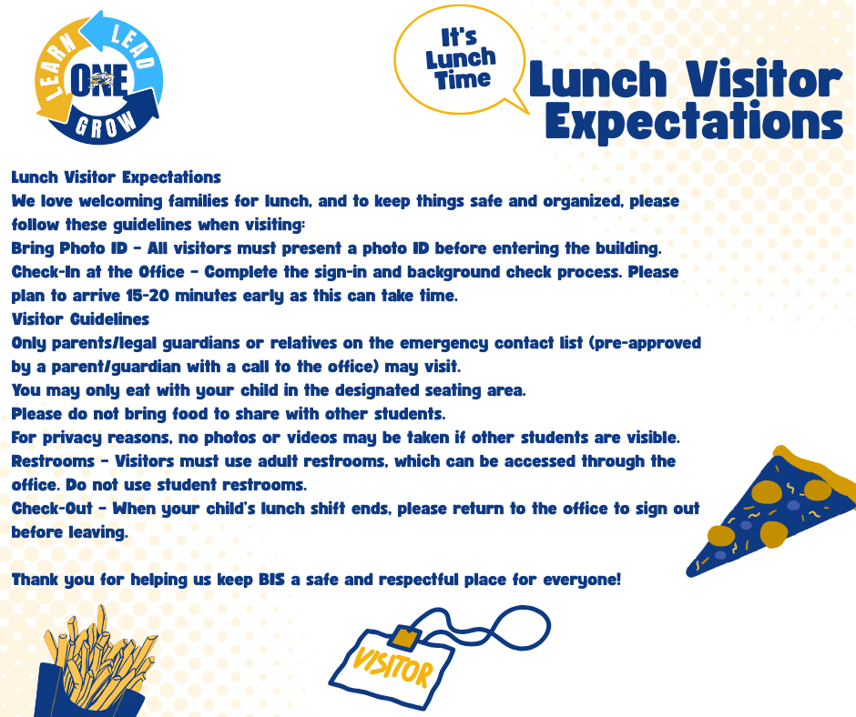 We are now allowing you to visit your student during lunch! Please see the expectations below.