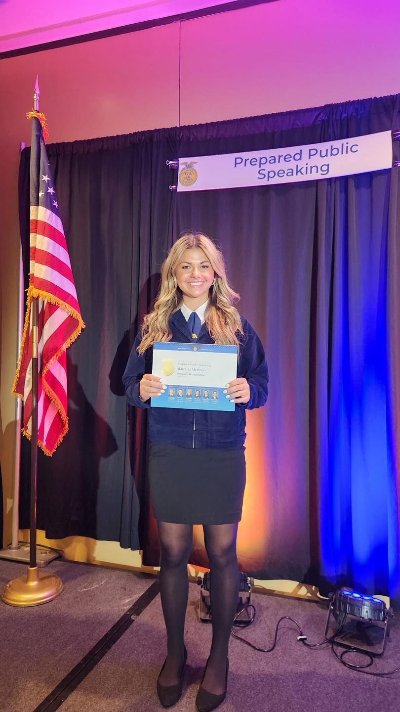 Congratulations to Makayla Methvin for finishing in the top 8 in the nation for Prepared Public Speaking at the National FFA Convention!